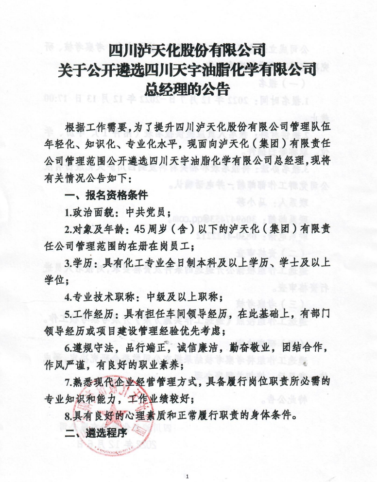 關(guān)于公開(kāi)遴選四川天宇油脂化學(xué)有限公司總經(jīng)理的公告